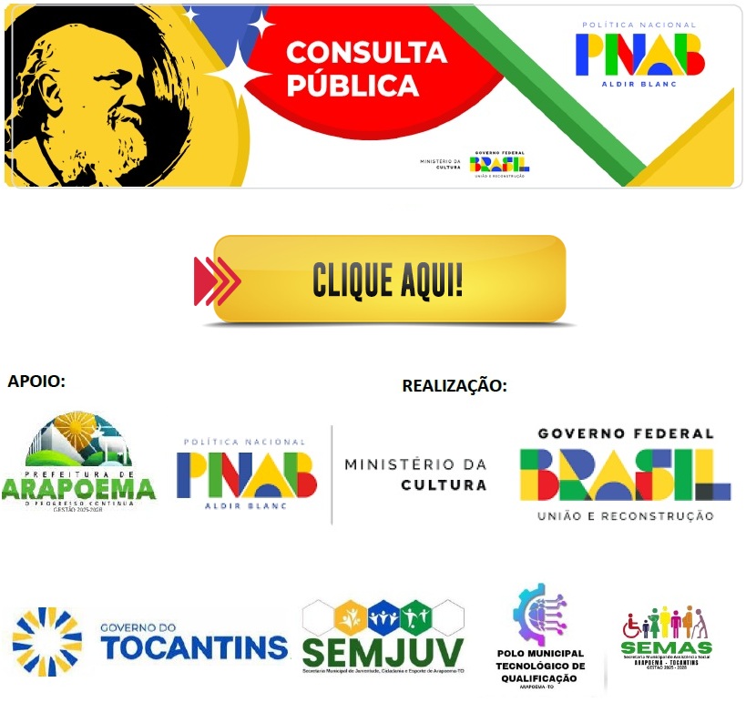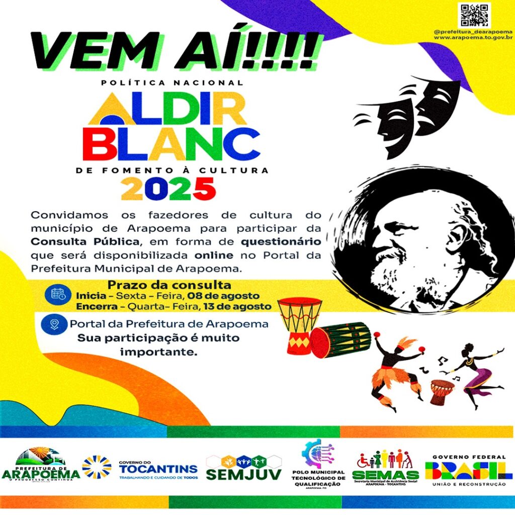 A Secretaria Municipal de Cultura convoca artistas, coletivos e produtores para debater o futuro da cultura no município – participe no dia 08 de agosto! A Secretaria Municipal de Cultura de Arapoema está organizando uma Consulta Pública a Lei Aldir Blanc 2025 no município. O questionário, que acontecerá no dia 08 de agosto, será um momento para ouvir propostas, avaliar impactos e planejar