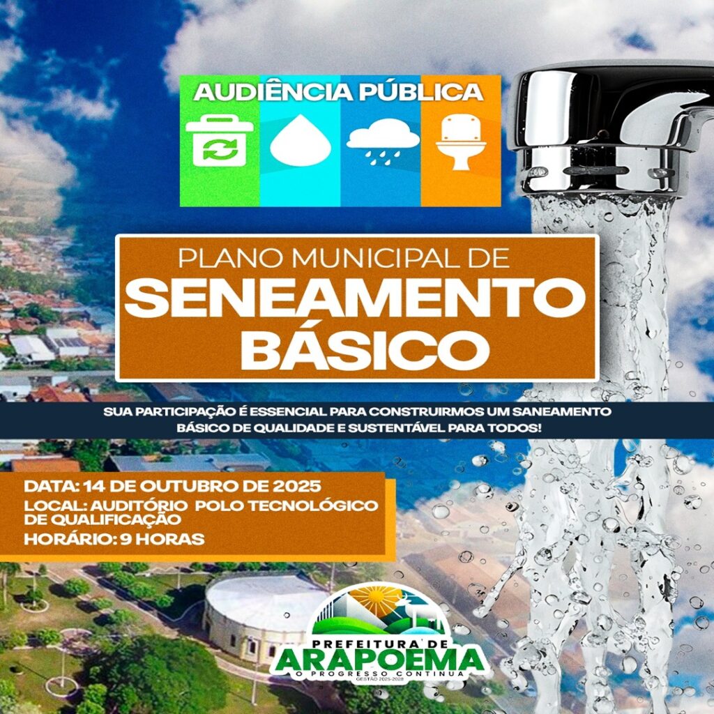 A Prefeitura Municipal de Arapoema convida toda a comunidade para participar da Audiência Pública de apresentação, discussão e recebimento de críticas e sugestões referentes à proposta de revisão do Plano Municipal de Saneamento Básico (PMSB), que abrange os eixos de abastecimento de água, esgotamento sanitário, manejo de resíduos sólidos e drenagem pluvial. 📅 Data: 14