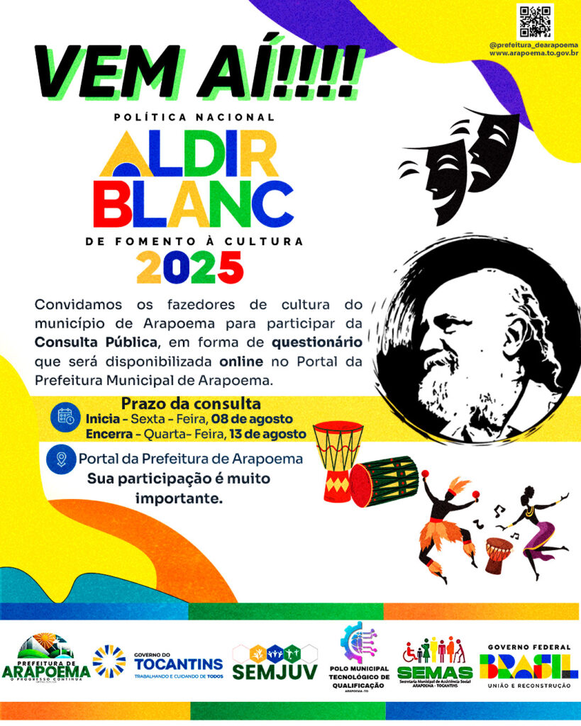 A Secretaria Municipal de Cultura de Arapoema está organizando uma Consulta Pública a Lei Aldir Blanc 2025 no município. O questionário, que acontecerá no dia 08 de agosto, será um momento para ouvir propostas, avaliar impactos e planejar ações que fortaleçam o setor cultural local.