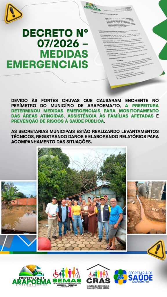 O PREFEITO DO MUNICÍPIO DE ARAPOEMA, Estado do Tocantins, no uso das atribuições que lhe confere a Lei Orgânica do Município, CONSIDERANDO as fortes e intensas chuvas ocorridas no Município de Arapoema/TO no dia 06 de março de 2026, que ocasionaram enchente histórica atingindo o zoneamento central da cidade; CONSIDERANDO que o evento climático ocorreu […]